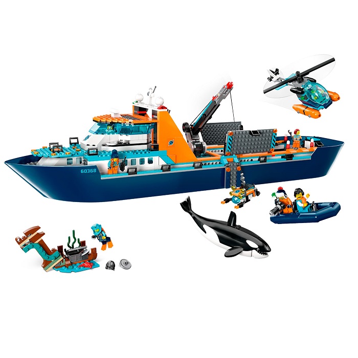 Веселые приключения ждут вас с могучим кораблем LEGO® City LEGO® City Arctic Explorer Ship (60368). Это огромное плавучее игрушечное судно наполнено реалистичными деталями для творческих исследовательских приключений. Этот премиальный игровой набор также включает в себя вертолет, шлюпку, подводную лодку ROV и затонувший корабль викингов, а также сундук с сокровищами, 7 минифигурок и фигурку касатки.